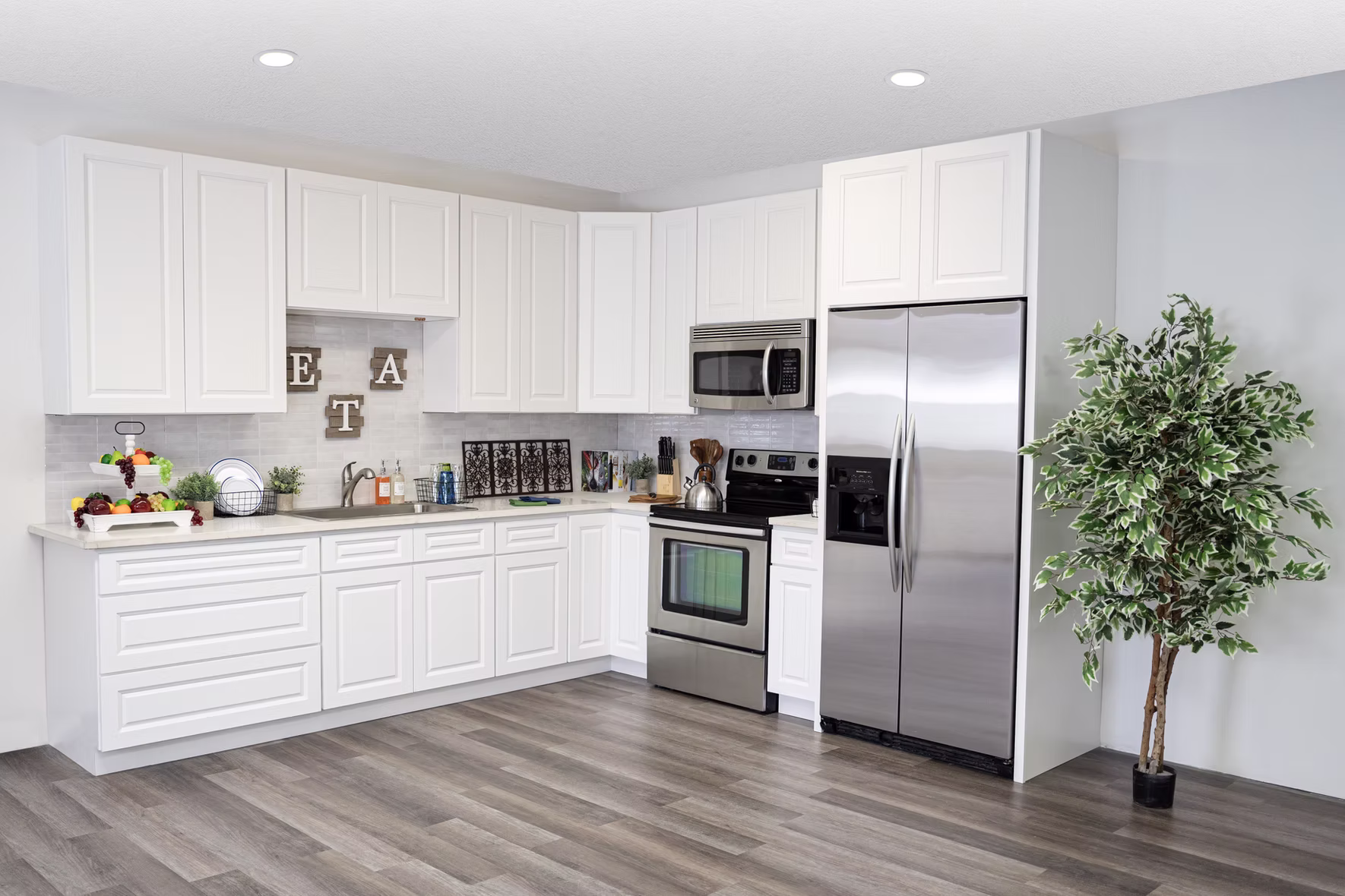 Our Glacier White cabinets exude timeless elegance with their raised panel detailing, adding a touch of sophistication to any kitchen.
